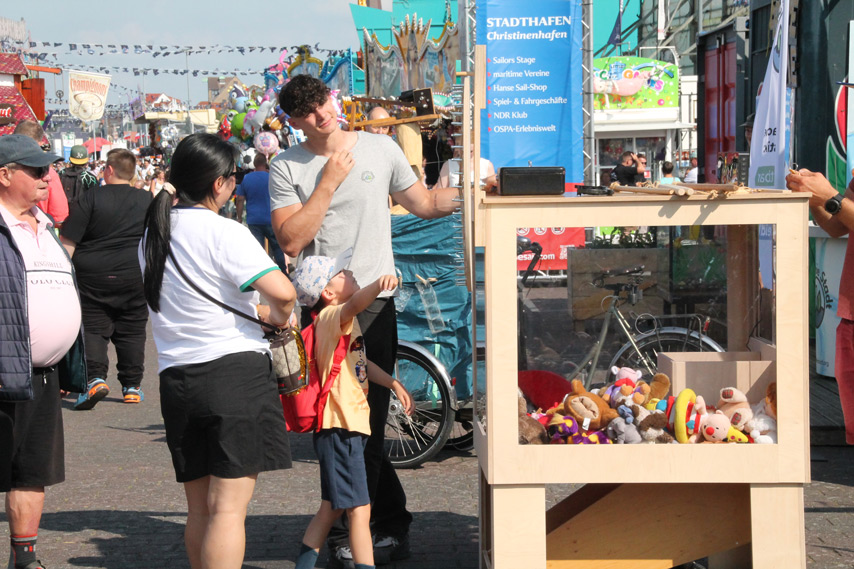 In unserer Kuscheltier Greifarm-Box können Second Hand Kuscheltiere auf verschiedene Art und Weisen geangelt werden. Wer schafft es, in 30-240 Sekunden mit Schlinge oder Holzstock das Lieblings-Plüschtier aus der Box zu fischen?